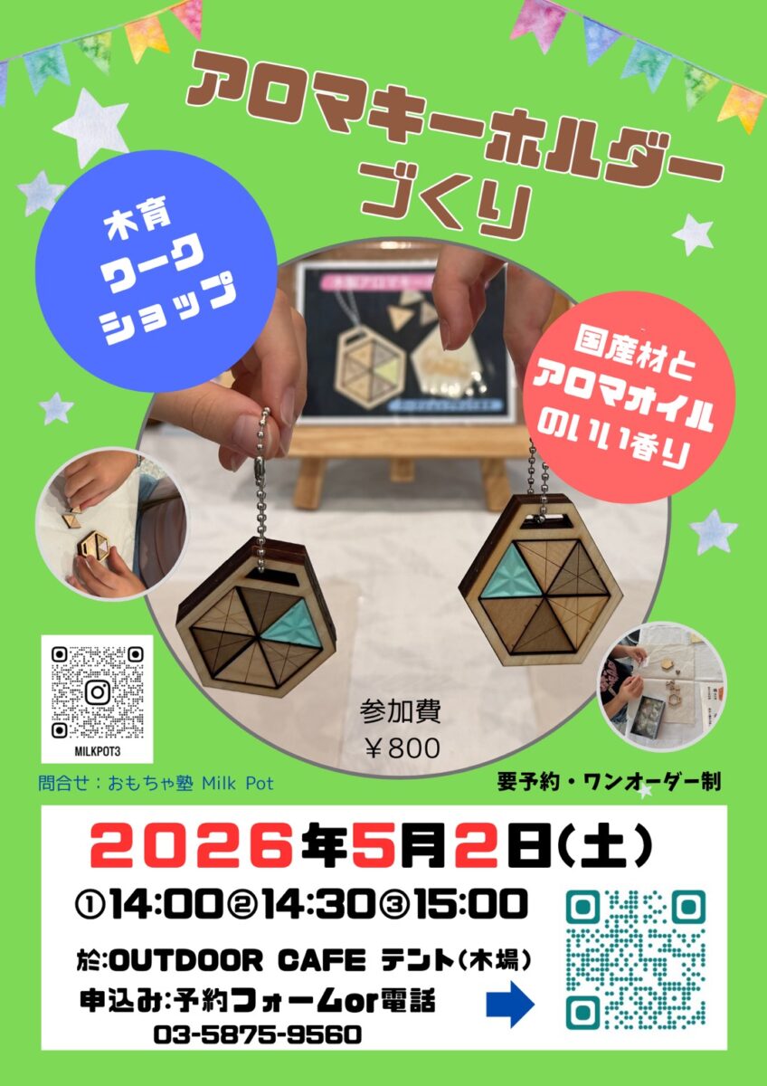 こんにちは。Outdoor Cafeテントです。いつも赤ちゃん広場でお世話になっているおもちゃ塾MILK POTさんが、大人向けに木育ワークショップを開催します!